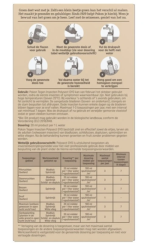 Pokon Bio Tegen Insecten Polysect GYO bestrijdt snel en effectief zowel de eitjes, larven als adulten (volwassen insecten) van bladluizen, schildluizen, dopluizen, spintmijten en witte vliegen. Na behandeling kunnen groenten en fruit zonder problemen gegeten worden. Pokon Tegen Insecten Polysect GYO kan van februari tot oktober gebruikt worden, zodra de eerste insecten of symptomen waarneembaar zijn. Niet gebruiken bij hoge temperaturen (boven 25 graden Celsius). Bij voorkeer ’s ochtends of ’s avonds gebruiken, om fel zonlicht te vermijden. De aangetasten bladeren (boven- en onderkant), stengels en de stam bespuiten tot afdruipen. Dode insecten kunnen enkele dagen op de bladeren blijven liggen voor ze eraf vallen. Maximaal 1-3 toepassingen per jaar, met een interval van minimaal 7 dagen. Was de drukspuit af na gebruik en verwijder gemorste vloeistof zodat er geen vlekken kunnen ontstaan.